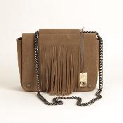 En cuir de veau lisse et daim couleur taupe. Existe aussi en vert clair.
