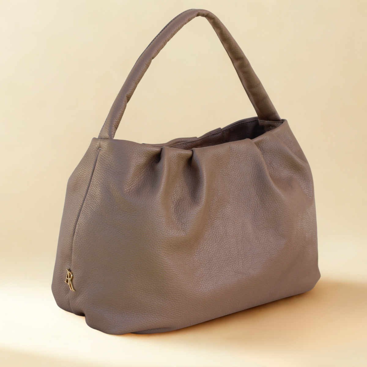 ​Signature Subtile : Le logo AR discret et doré, placé en bas du sac, affirme l'identité de la Maison.